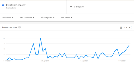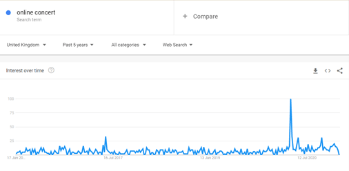 Whilst some venues such as the aforementioned have chosen the socially distanced in-person gig approach to getting live music back on its feet, others such as, The Globe, Sunderland’s Independent, and Motorhouse Studios have endeavoured down the path of live streamed gigs and events. Evidence suggests that this may not just be a local occurrence as according to data from Google Trends, search and interest rates in the UK for the terms ‘online concert’ and ‘livestream concert’ have soared in comparison to the last five years since the beginning of 2020, with peaks in the months where the country had just entered national lockdowns.
